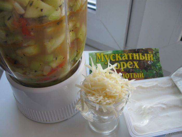 Сливки, молоко, творожный сыр, мускатный орех на кончике ножа смешать с измельченным луком и цуккини. Натереть сыр Пармезан, добавить к смеси.