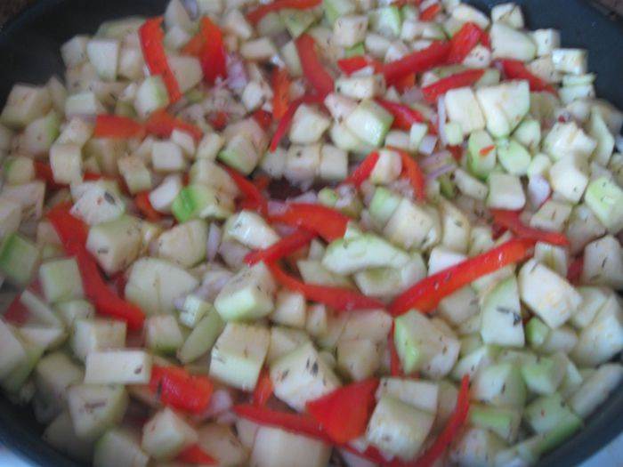 Лук и кабачки нарезать небольшими кубиками, перец красный сладкий нарезать пластинами, чеснок пропустить через пресс, посолить, поперчить.