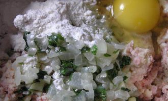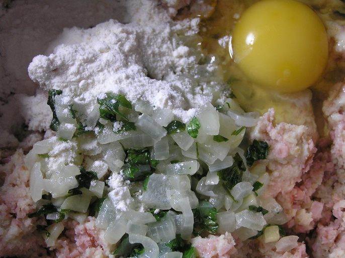 К размоченному хлебу добавить фарш из мясных изделий, обжаренные овощи в сковороде, яйца и муку, перемешать.