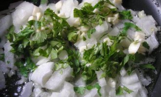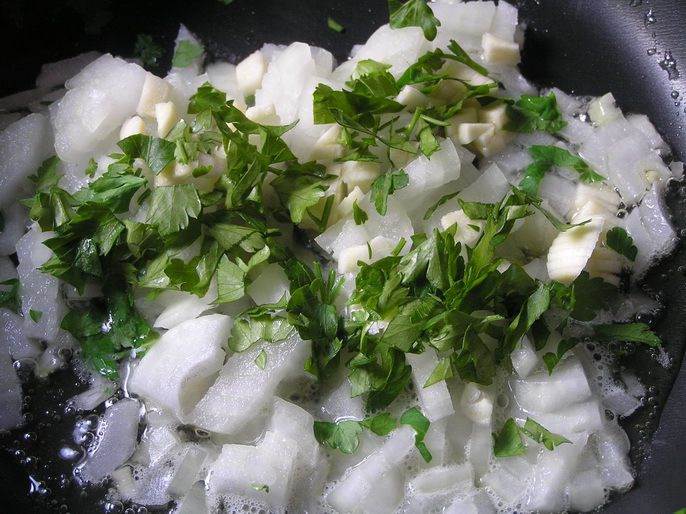 Лук, чеснок и петрушку измельчить и обжарить на сливочном масле (у меня смесь растительного и сливочного).