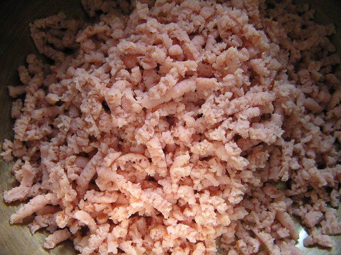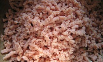 Мясные изделия провернуть через мясорубку.