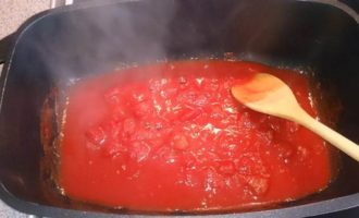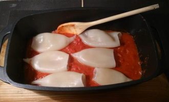 Добавляем к нашему готовому соусу целые отварные тушки кальмаров.