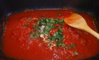 Добавляем рубленный базилик, чеснок, чили, щепотку крупной морской соли и молотую смесь перцев.