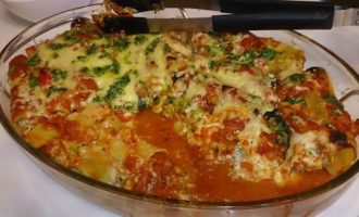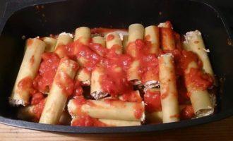 Выкладываем фаршированные каннеллони (отваривать предварительно не требуется), поливаем соусом.