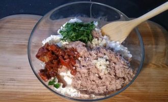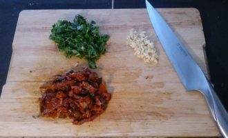 Подготавливаем начинку: рубим базилик, чеснок и вяленые томаты.