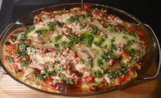 Посыпаем сыром и ставим в духовку, разогретую до 180°С на 30 минут.