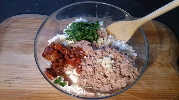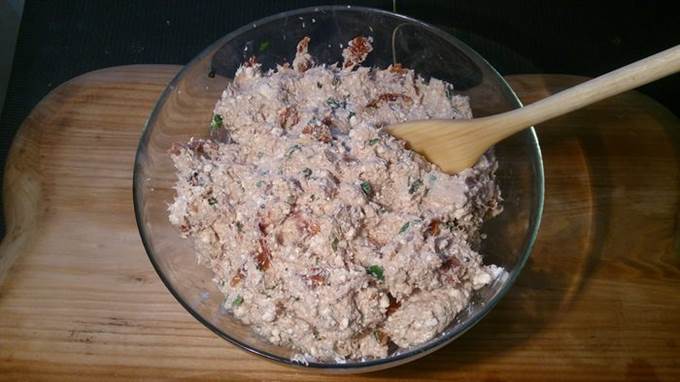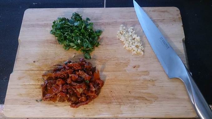 Подготавливаем начинку: рубим базилик, чеснок и вяленые томаты.