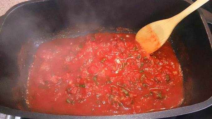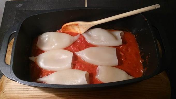 Добавляем к нашему готовому соусу целые отварные тушки кальмаров.