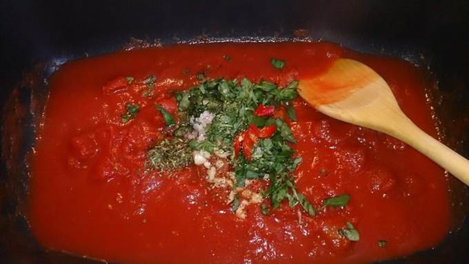 Добавляем рубленный базилик, чеснок, чили, щепотку крупной морской соли и молотую смесь перцев.