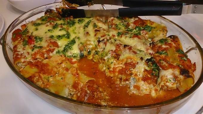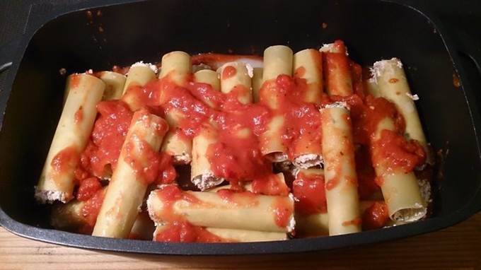 Выкладываем фаршированные каннеллони (отваривать предварительно не требуется), поливаем соусом.
