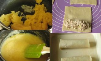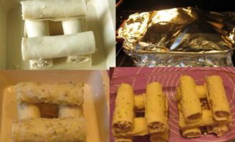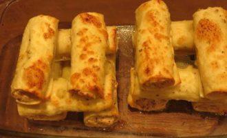 Выкладываем начинку на пласт теста, заворачиваем. Теперь отклонение от классики, начиняем концы каннеллони, начинка должна образовывать плотное «бревно» иначе при запекании концы деформируются. Кладем первые две трубочки каннеллони параллельно. На них «срубом» еще две. -