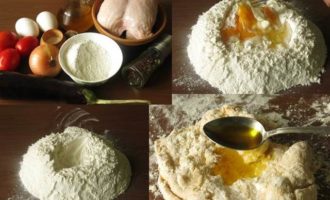 Подготовим муку, яйца и масло горчичное для теста. Начинка: филе куриной грудки, баклажан, лук, орехи, соль, перец. Соус: масло сливочное, мука, сметана, бульон. На первом фото не все компоненты, так как состав блюда определялся по мере приготовления. Муку просеиваем, высыпаем горкой с кратером, вбиваем 4 яйца, солим. Вилкой сбиваем яйца и начинаем захватывать муку, замешивать. Добавляем ложку горчичного масла, рекомендую использовать Biolio, это придаст оттенок вкуса горчицы, чуть добавит цвета, яркости тесту, золотистого оттенка. Кроме этого, тесто для каннеллони будет более эластичным.