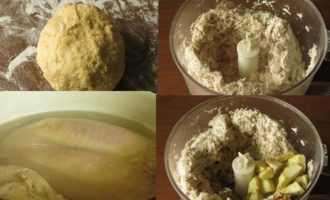 Замешиваем тесто. Ставим его на 1 час в холодильник, от выветривания закрываем шар пленкой. Отвариваем грудку, (всего 600 г отваренного мяса), измельчаем мясо с луком, добавляем баклажан без шкурки, орехи, специи.