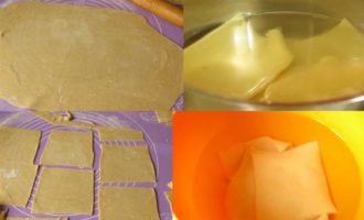 Раскатываем тесто на припыленном мукой столе. Нарезаем квадраты 10х10. Отвариваем тесто по 2 минуты в кипящей соленой воде. Вынимаем пласты теста и кладем в холодную воду.