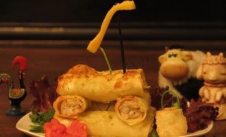 Складываем колодец, смазывая соусом «бревна» каннеллони. Чуть соуса кладем внутрь колодца для сочности. Сборку лучше проводить в форме, смазанной маслом. Всего получилось три колодца, три бревна, остатки половинки ведра. Накрываем фольгой и ставим в духовку при 180°С на 15 минут. Снимаем фольгу и еще запекаем 5 — 7 минут при конвекции.