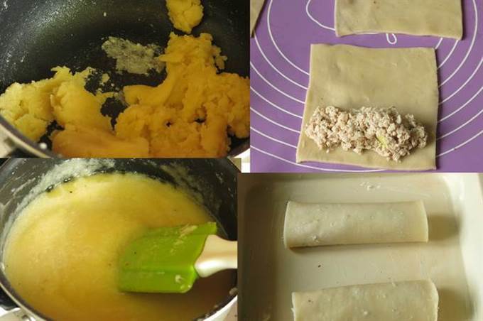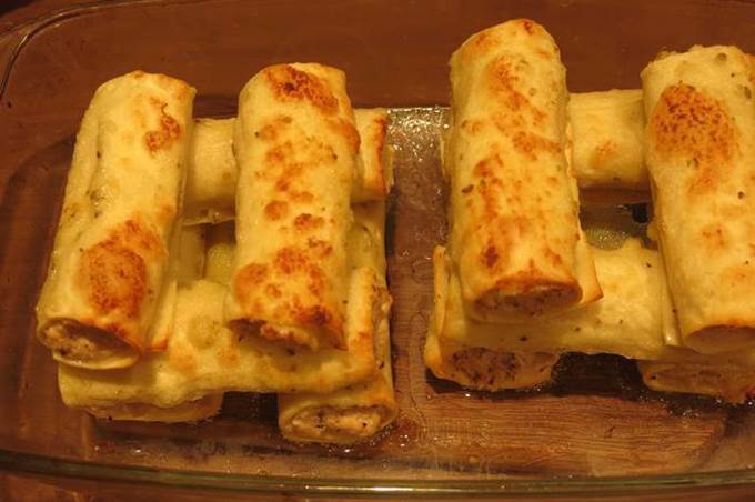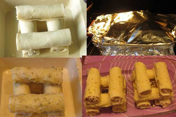 Выкладываем начинку на пласт теста, заворачиваем. Теперь отклонение от классики, начиняем концы каннеллони, начинка должна образовывать плотное «бревно» иначе при запекании концы деформируются. Кладем первые две трубочки каннеллони параллельно. На них «срубом» еще две. -