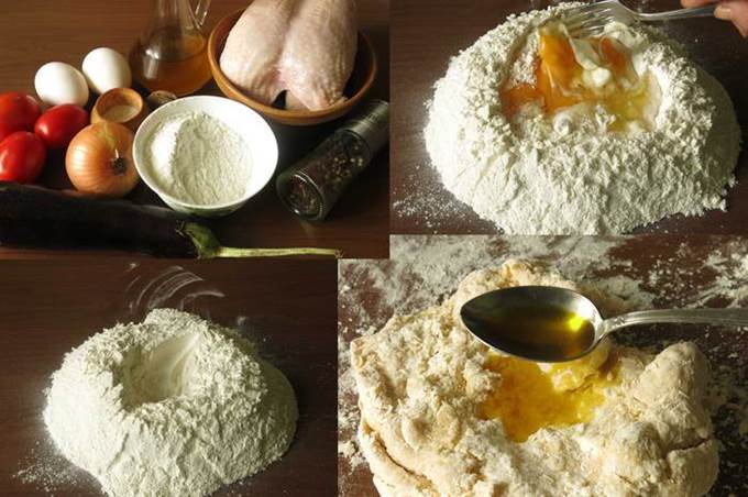 Подготовим муку, яйца и масло горчичное для теста. Начинка: филе куриной грудки, баклажан, лук, орехи, соль, перец. Соус: масло сливочное, мука, сметана, бульон. На первом фото не все компоненты, так как состав блюда определялся по мере приготовления. Муку просеиваем, высыпаем горкой с кратером, вбиваем 4 яйца, солим. Вилкой сбиваем яйца и начинаем захватывать муку, замешивать. Добавляем ложку горчичного масла, рекомендую использовать Biolio, это придаст оттенок вкуса горчицы, чуть добавит цвета, яркости тесту, золотистого оттенка. Кроме этого, тесто для каннеллони будет более эластичным.