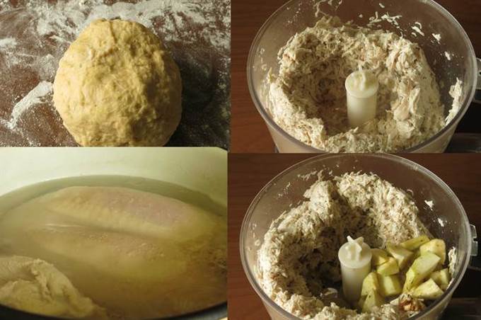 Замешиваем тесто. Ставим его на 1 час в холодильник, от выветривания закрываем шар пленкой. Отвариваем грудку, (всего 600 г отваренного мяса), измельчаем мясо с луком, добавляем баклажан без шкурки, орехи, специи.