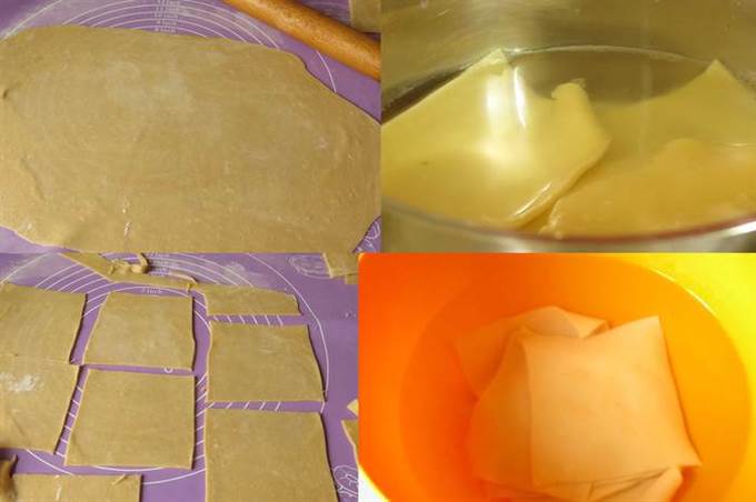 Раскатываем тесто на припыленном мукой столе. Нарезаем квадраты 10х10. Отвариваем тесто по 2 минуты в кипящей соленой воде. Вынимаем пласты теста и кладем в холодную воду.