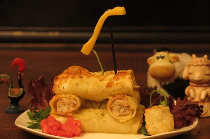 Складываем колодец, смазывая соусом «бревна» каннеллони. Чуть соуса кладем внутрь колодца для сочности. Сборку лучше проводить в форме, смазанной маслом. Всего получилось три колодца, три бревна, остатки половинки ведра. Накрываем фольгой и ставим в духовку при 180°С на 15 минут. Снимаем фольгу и еще запекаем 5 — 7 минут при конвекции.