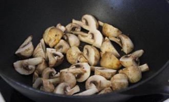 Забросьте капеллини в кипящую воду и засеките время 3 минуты. Начните обжаривать шампиньоны, порезаные на 4-8 частей, слегка посолите и посыпьте сухими итальянскими травами.