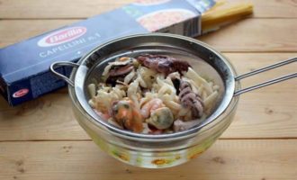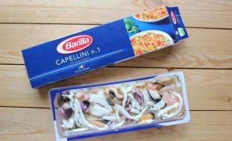 Поставьте кастрюльку с водой на огонь. Достаньте с полки упаковку капеллини «Barilla», а из холодильника упаковку морского коктейля в масле.