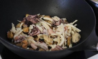 К обжаренным шампиньонами добавьте морской коктейль и влейте вино, потушите все вместе и соус готов.