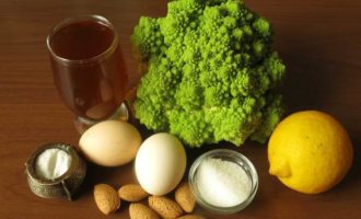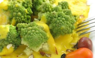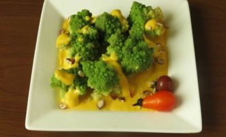 • Капусту выкладываем на блюдо, солим, поливаем соусом и посыпаем миндалем.