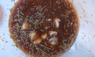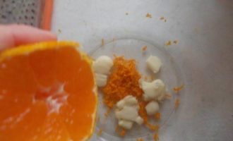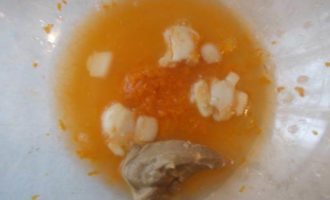 • Приготовим маринад. Для этого потереть цедру одного мандарина и выдавить весь сок. Добавить раздавленный чеснок.