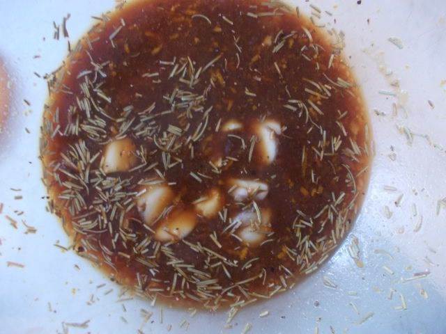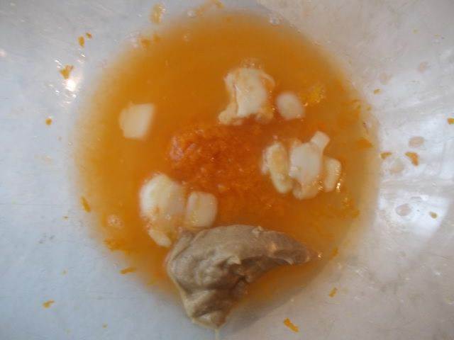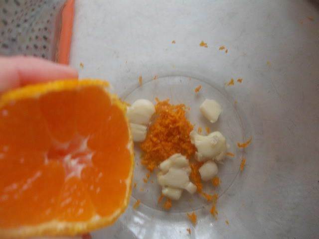 • Приготовим маринад. Для этого потереть цедру одного мандарина и выдавить весь сок. Добавить раздавленный чеснок.