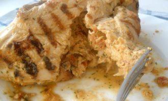 Обжарить на гриле кармашки со всех сторон. Выложить в стеклянную форму. Смазать немного оливковым маслом — иаче будет суховато. Поставить в духовку и выпекать около 25 минут!