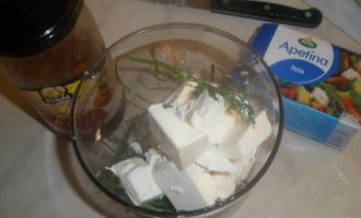 Разогреть сковороду гриль. Духовку включить на 200 градусов. Приготовить начинку для кармашков: в блендере измельчить фету, укроп, чеснок и томаты. Добавить базилик. Получится однородная масса.
