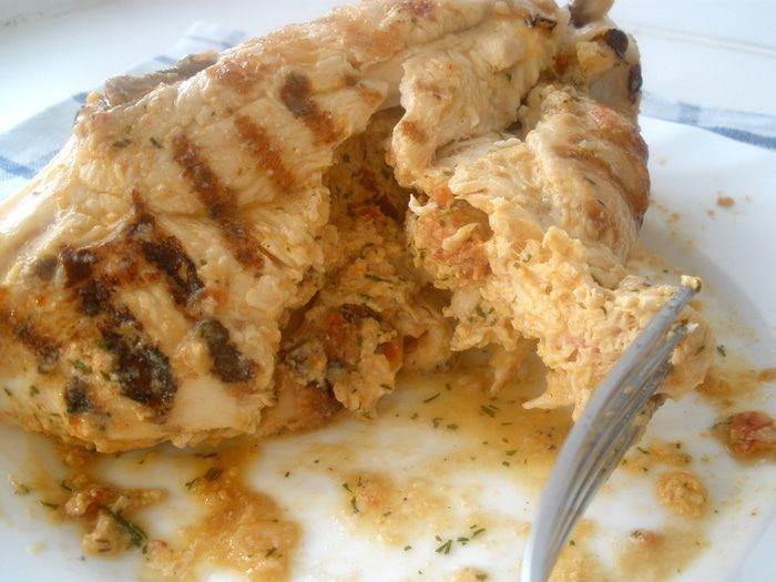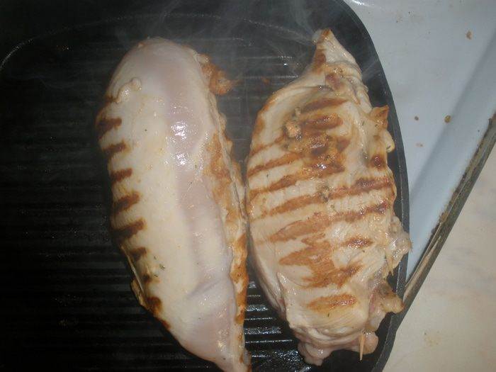 Обжарить на гриле кармашки со всех сторон. Выложить в стеклянную форму. Смазать немного оливковым маслом — иаче будет суховато. Поставить в духовку и выпекать около 25 минут!