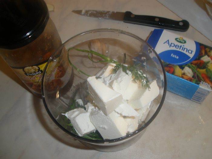 Разогреть сковороду гриль. Духовку включить на 200 градусов. Приготовить начинку для кармашков: в блендере измельчить фету, укроп, чеснок и томаты. Добавить базилик. Получится однородная масса.
