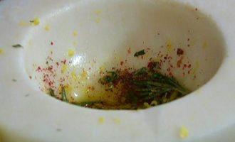 • Половину розового перца, тимьян, розмарин, морскую соль и смесь перца растереть в ступке, затем добавить цедру лимона и 1-2 ст. ложки оливкового масла.