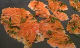 • Семгу нарезать тонкими полосками и смазать пряной заправкой.