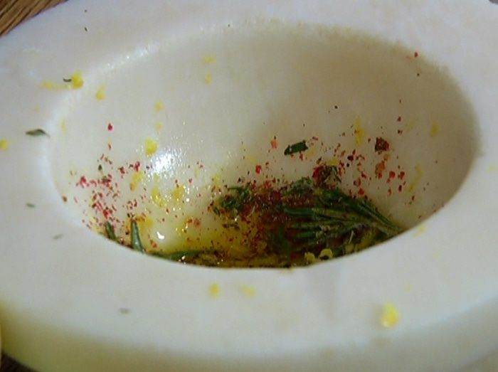 • Половину розового перца, тимьян, розмарин, морскую соль и смесь перца растереть в ступке, затем добавить цедру лимона и 1-2 ст. ложки оливкового масла.