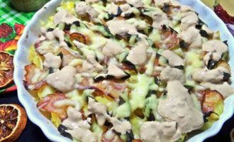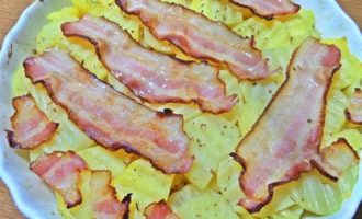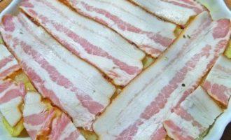 • Сверху накрыть беконовыми пластинками. Забегая вперед, советую: бекон поделить на 3 части. Так удобнее будет накладывать и кушать.