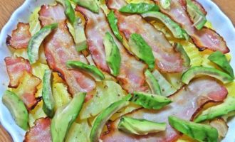• В форму после духовки, нарезать авокадо любым способом.