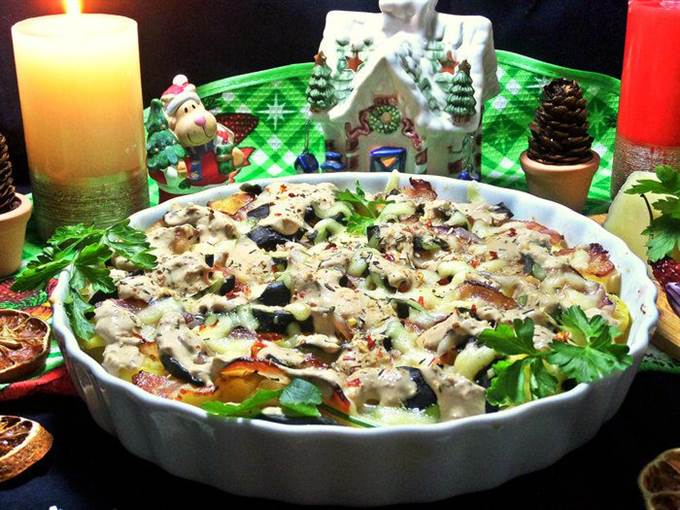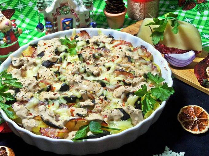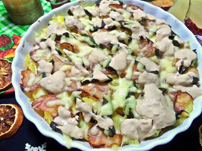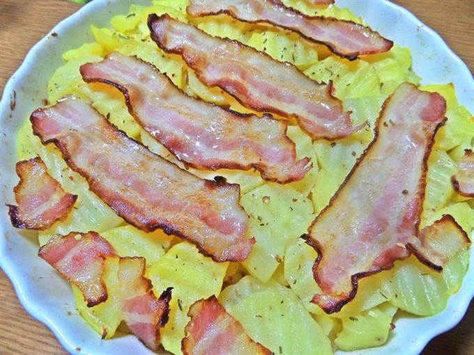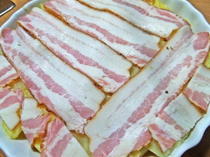 • Сверху накрыть беконовыми пластинками. Забегая вперед, советую: бекон поделить на 3 части. Так удобнее будет накладывать и кушать.