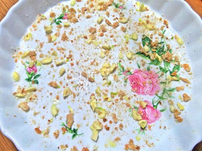 • Форму 22 см в диаметре смазать маслом, обсыпать сухарями и покрошить на дно чеснок, можно крупно в данном случае.