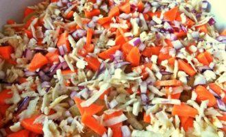 Лук измельчить, корень сельдерея натереть.