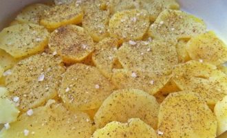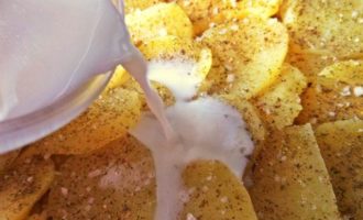 Снова картофельный слой, соль, перец и заливаем молоком.