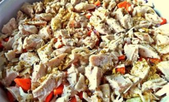Рассыпать овощи на картофельный слой.