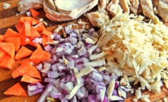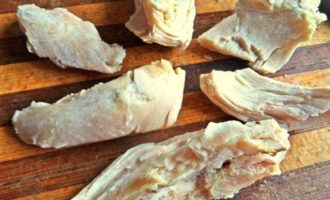 Куриное филе брала отварное. Нарезать на кусочки.