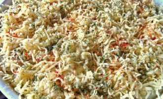 Верх посыпаем тёртым сыром, укропом и томатными хлопьями. По краям воткнуть лавровые листики. Сыр можно и в середину насыпать тоже, кто сильно любит!