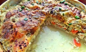 Половину выложить в смазанную форму, посолить, поперчить.