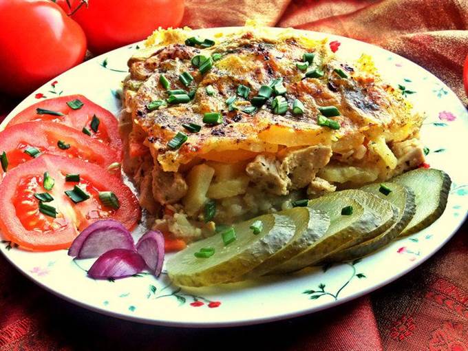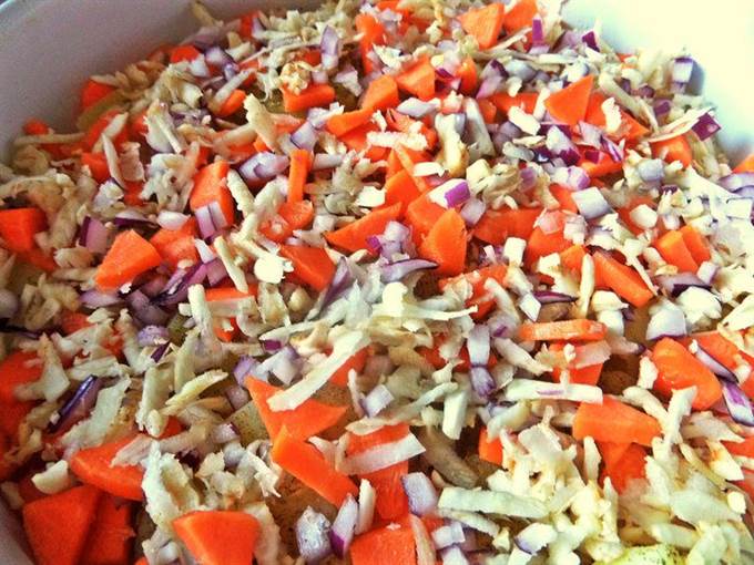 Запекаем до румяного верха около получаса. Продукты брали готовые, только кореньям нужно проготовиться.