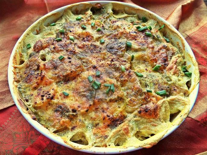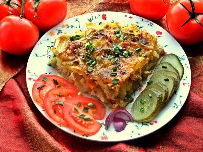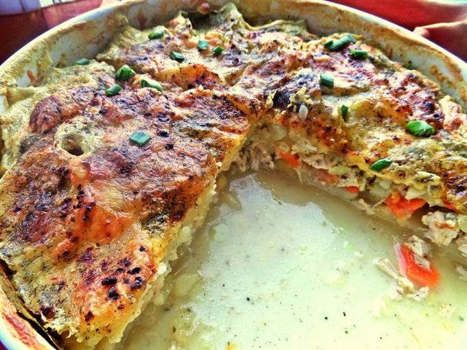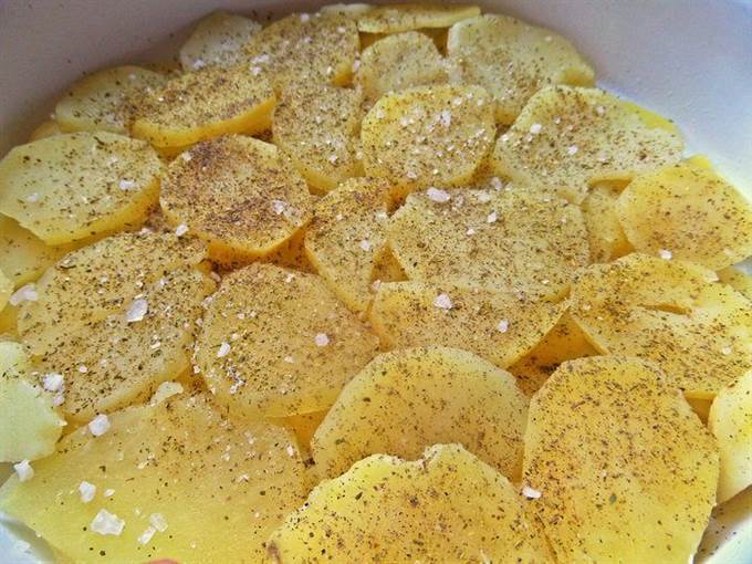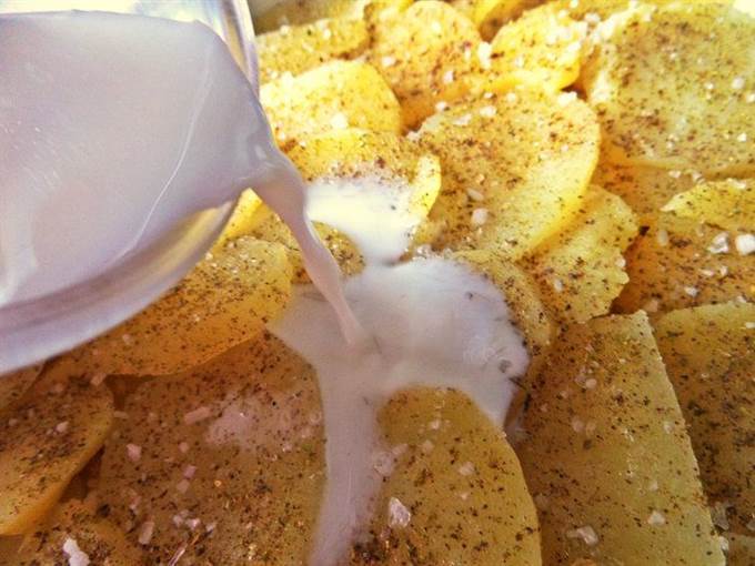 Снова картофельный слой, соль, перец и заливаем молоком.