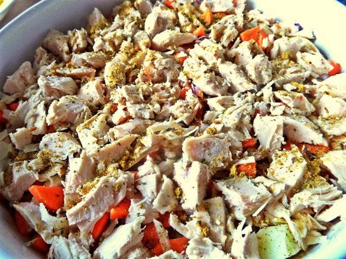 Сверху курица и приправы для курицы.